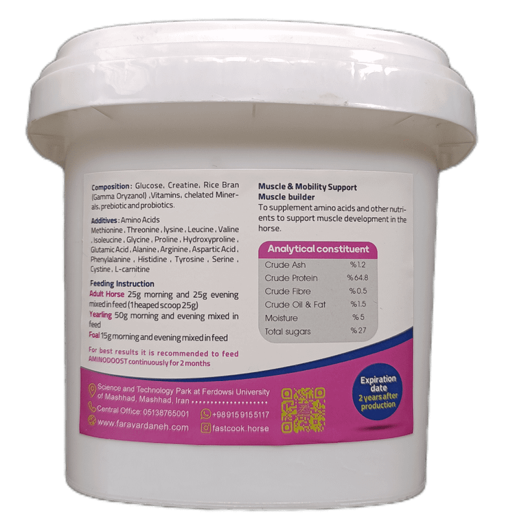 مکمل تخصصی عضله ساز اسب آمینودوست از برند معتبر فستکوک است. این مکمل یک فرمول پیشرفته برای رشد و تقویت عضلات اسب، افزایش قدرت و بهبود استقامت اسبهاست. این محصول ویژه، با ترکیب دقیق اسیدهای آمینه ضروری برای اسب، کراتین و گاما اوریزانول، برای اسبهای مسابقهای، کرههای در حال رشد و اسبهایی که تحت تمرینات سنگین هستند، طراحی شده است. این مکمل شامل اسیدهای آمینه مناسب برای تقویت عضلات اسب میباشد.