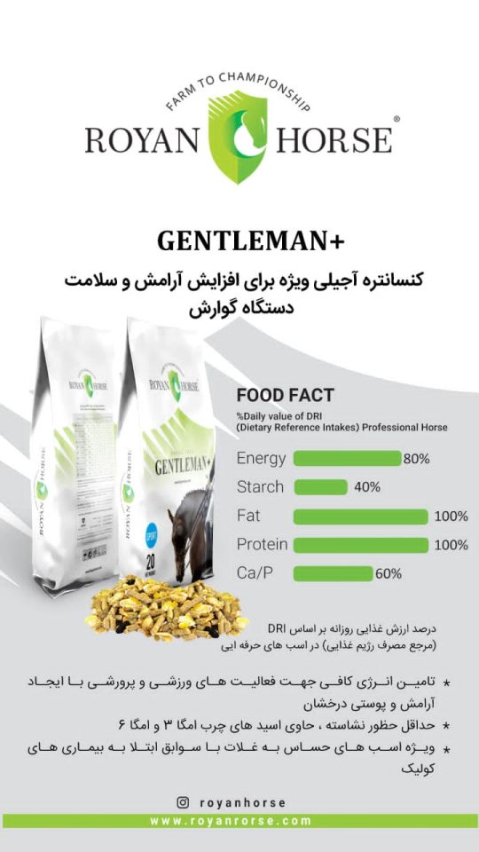 خوراک پلت Cool جنتلمن (Gentleman) یک کنسانتره تخصصی برای اسبهای ورزشی و اسبهایی با سیستم گوارشی حساس به غلات و نشاسته است. این خوراک با فرمولی خاص و میزان نشاسته بسیار پایین طراحی شده تا بدون ایجاد مشکلات گوارشی، انرژی مورد نیاز اسب را تأمین کند.